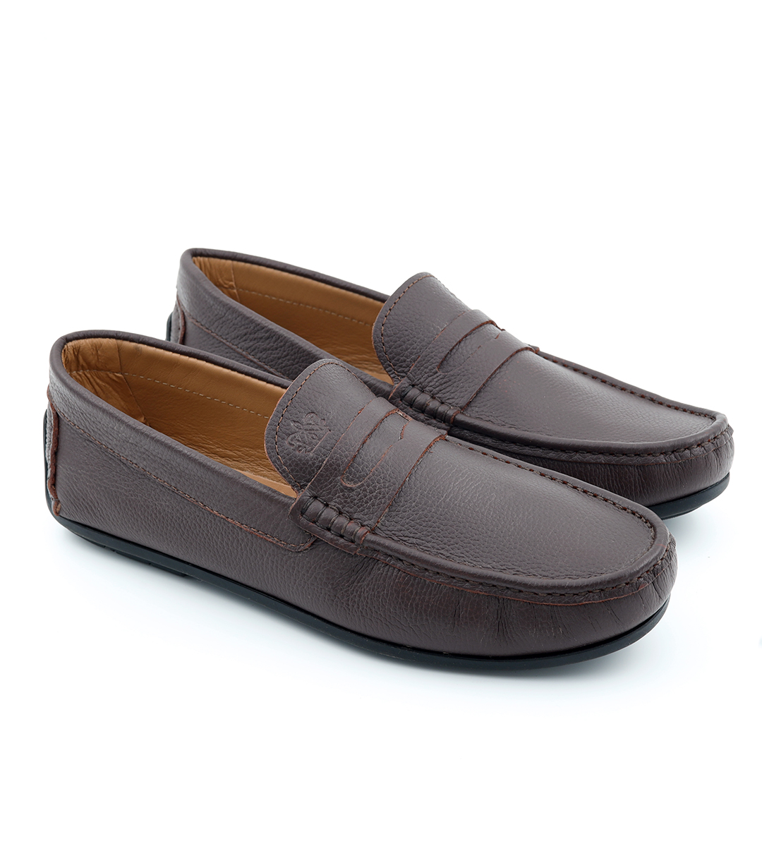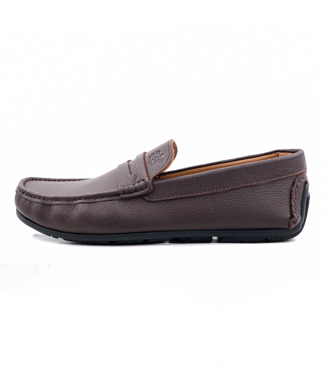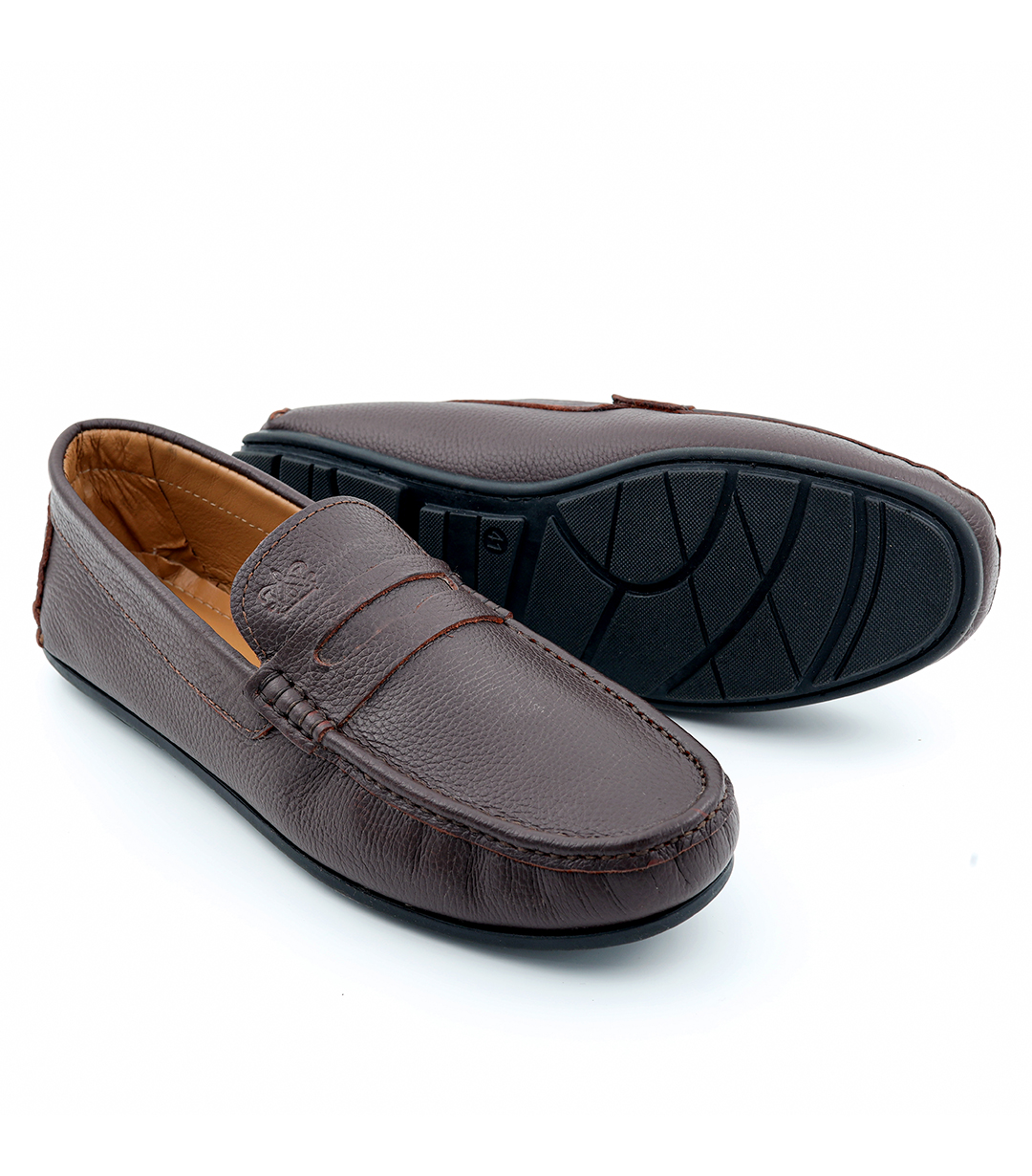 A pair of solid round-toe formal loafers featuring a slip-on closure, crafted with a synthetic leather upper and a textured, patterned rubber outsole.